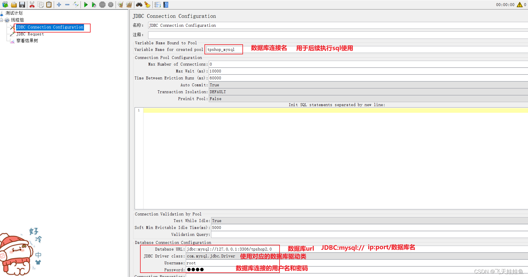 添加方式:测试计划—>线程组—>(右键添加)配置元件—>JDBC Connection Configuration