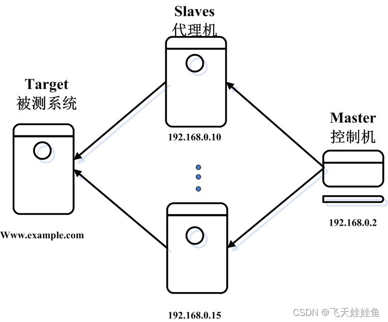 分布式测试:当性能测试时需要模拟的负载(用户/请求)太高,一台测试机无法模拟,需要多台测试机一起来模拟达到要求的负载量,这就叫分布式。