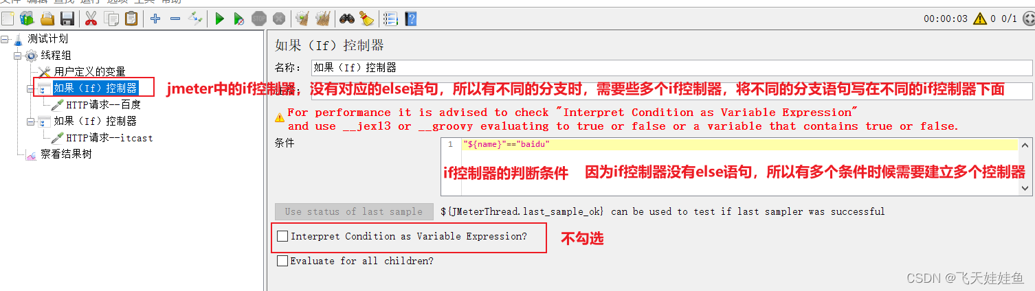 勾选上Interpret Condition as Variable Expression,判断条件需要使用jex13函数。(使用这个函数来进行判断时,Jmeter自身的执行效果要更高一些。