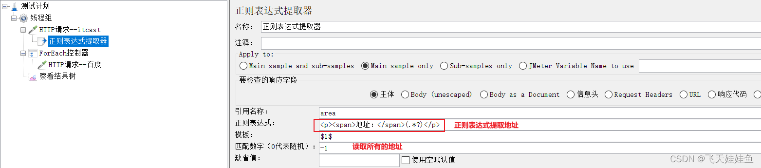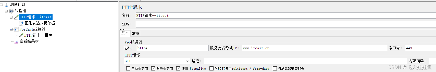 1)添加HTTP请求,获取 http://itcast.cn首页中的地址信息;