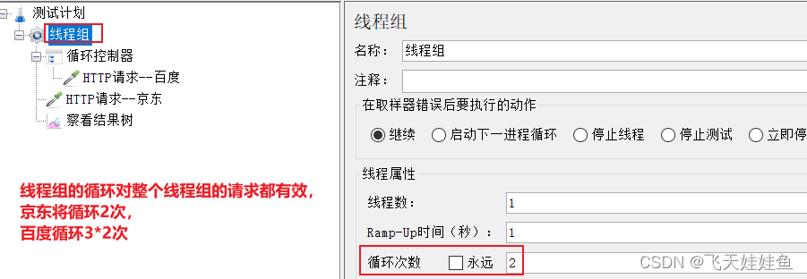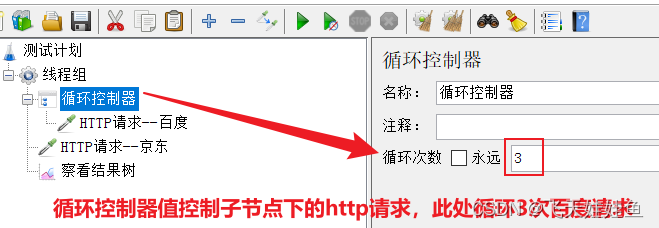 循环控制器只控制其子节点下的http请求,线程组对所有的请求都有效;