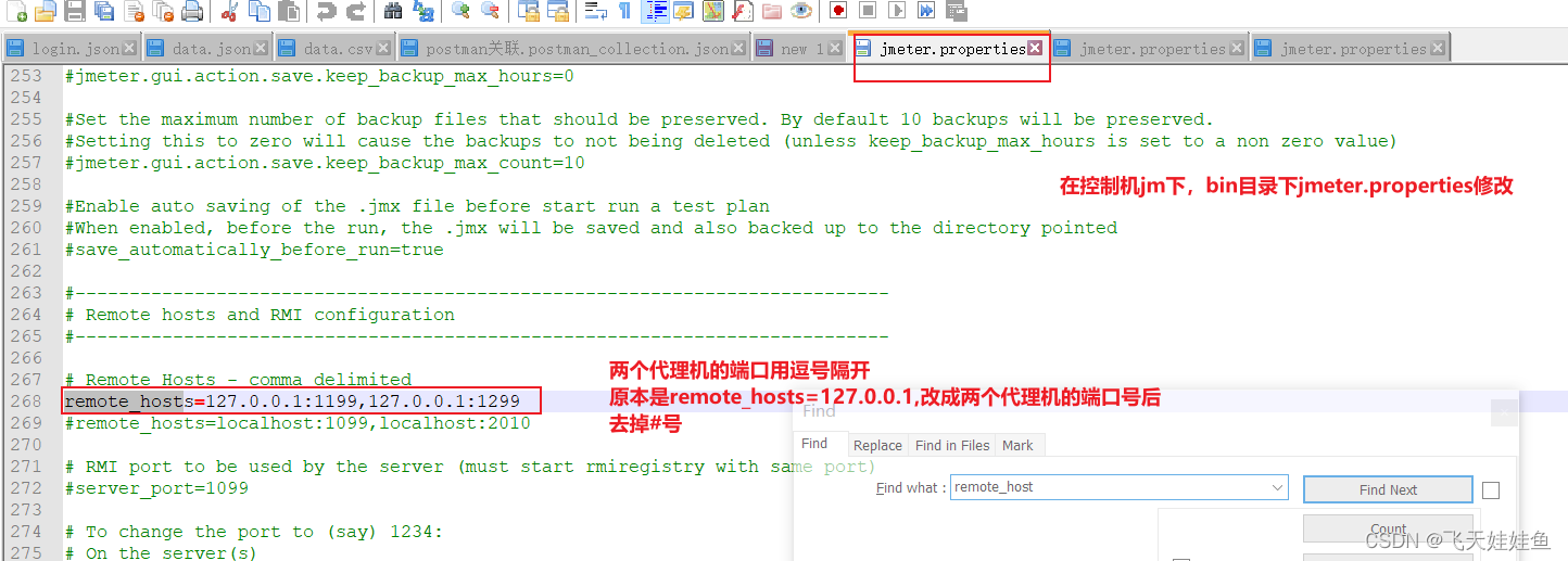 1)修改JMeter的bin目录下jmeter.properties配置文件,修改remote_hosts;