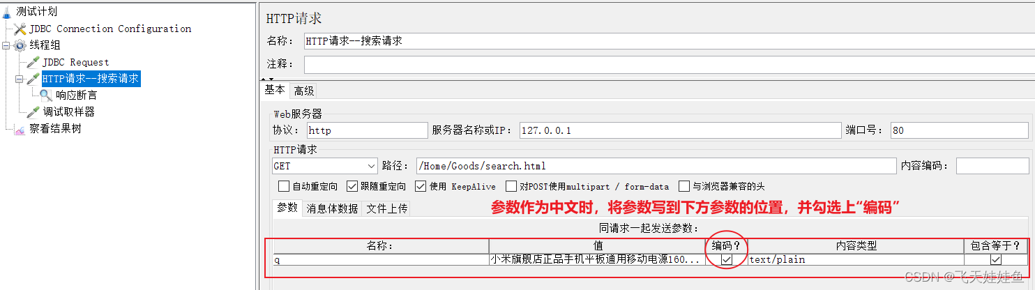 参数为中文时,将参数写到下方参数位置,并勾选上"编码"