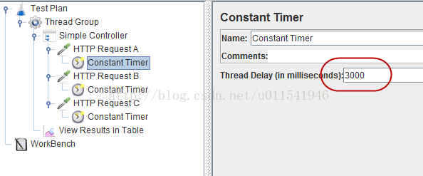 6. 分别设置三个Constant Timer的思考时间为3000毫秒