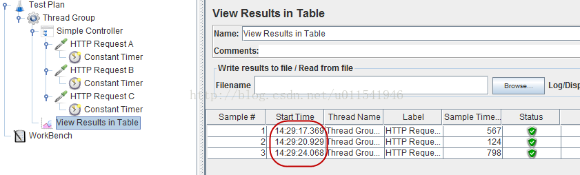 7. 执行测试,可以查看每个request之间时间相差3秒