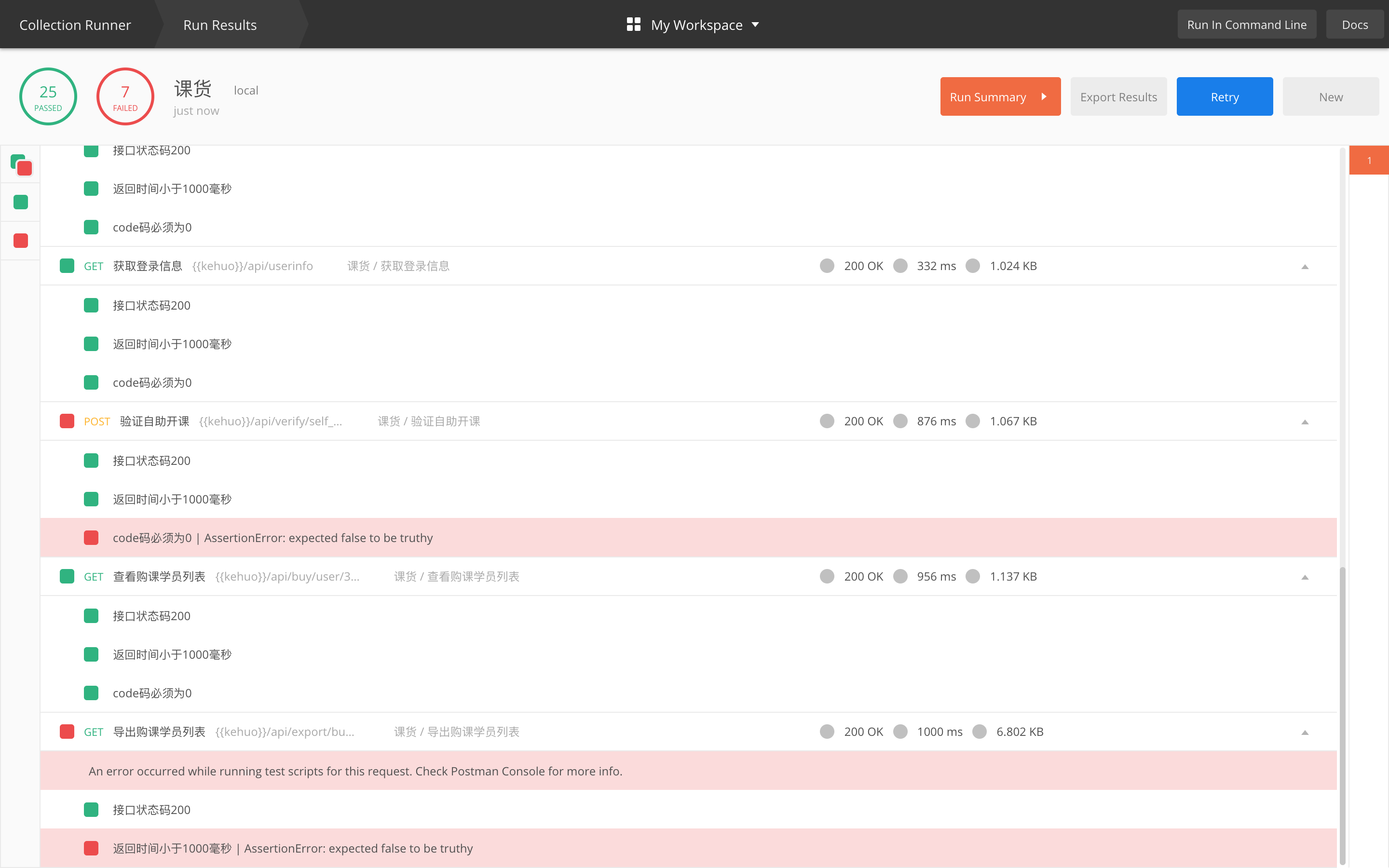 可以看到,我们测试了32个接口,其中25个通过,7个失败,有的是时间不满足要求,有的是状态码不对。