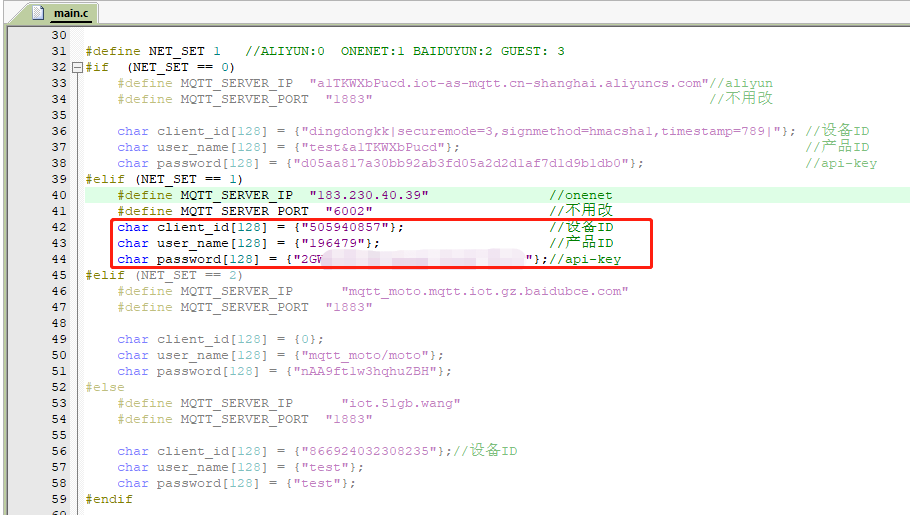 设备端连接onenet:只需修改:如下部分即可。分别对应onenet服务器端的设备id,产品id和api-key。