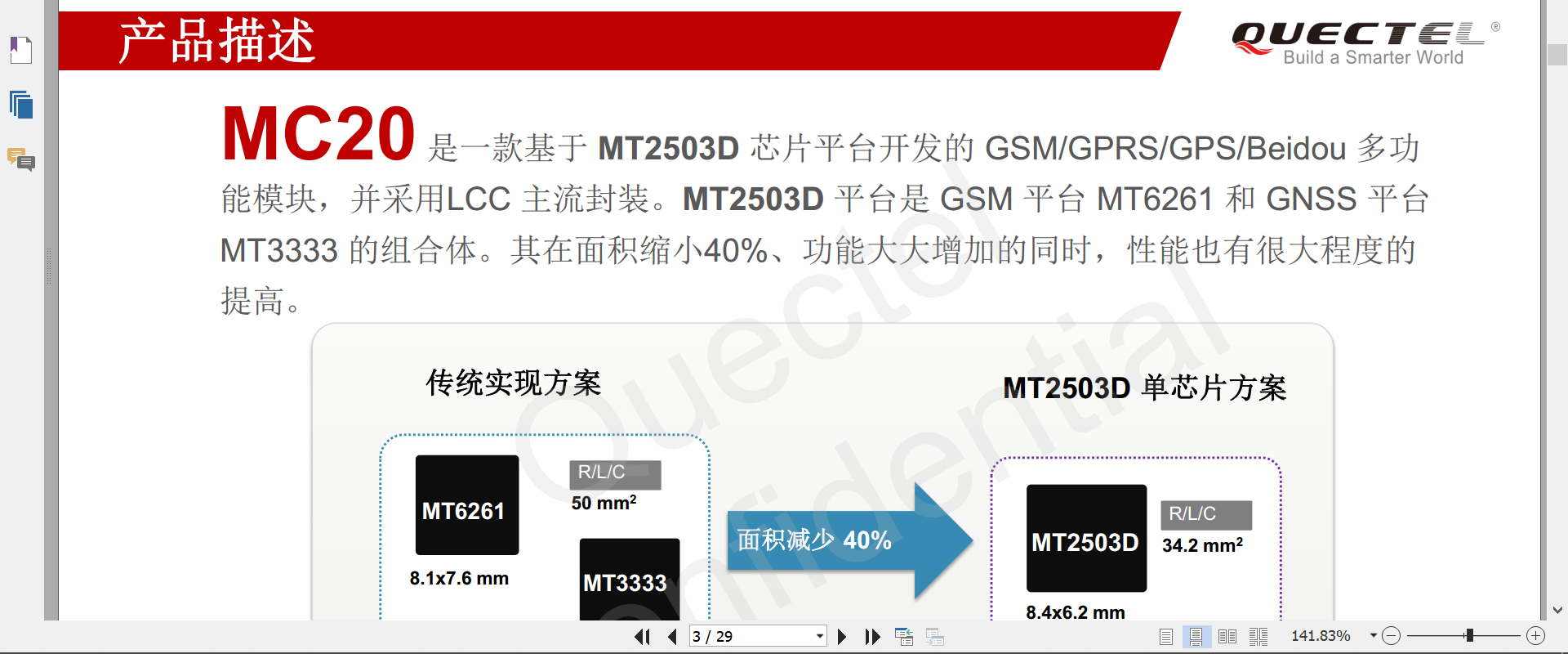 MC20模块采用联发科技最新推出的多功能通信定位芯片研制而成。它是一款集成LCC封装、四频段GSM/GPRS和先进算法GNSS引擎于一体的全功能通信模块,具有超小体积、低功耗、双卡单待等优势。MC20不仅内嵌丰富的网络协议(如 TCP、UDP、PPP、FTP、HTTP以及SSL),还集成了多星座卫星系统(如北斗、GPS、QZSS),因此能提供无线移动通信以及精准的导航定位功能。