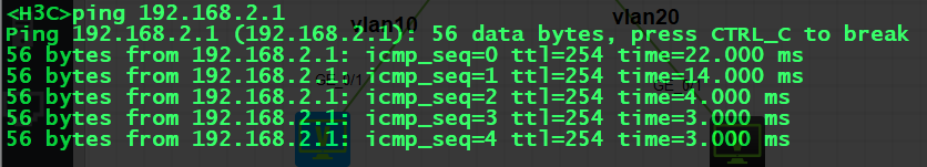 步骤类似配置g0/0.1[R1]interface g0/0.2 [R1-GigabitEthernet0/0.2]vlan-type dot1q vid 20 [R1-GigabitEthernet0/0.2]ip address 192.168.2.254 24分析:配置结束后,在 R1 上查看路由表,会发现已经产生了到达192.168.1.0/24网段和192.168.2.0/24网段的直连路由,出接口分别指向各自子接口,证明路由器已经可以对 Vlan10 和 Vlan20 间的数据进行三层转发了