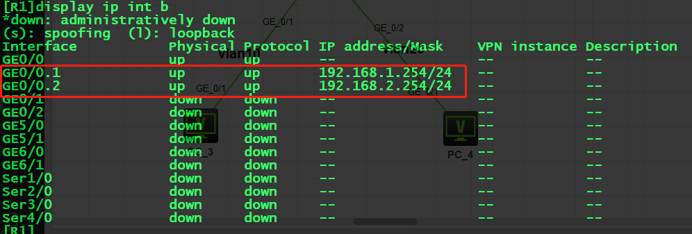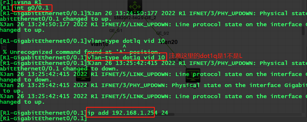 [R1]interface g0/0.1 创建g0/0.1子接口 [R1-GigabitEthernet0/0.1]vlan-type dot1q vid 10开启 dot1q (就是802.1Q)识别,绑定到 Vlan10[R1-GigabitEthernet0/0.1]ip address 192.168.1.254 24 -