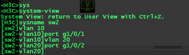 步骤 1:在 SW2 上创建 Vlan10 和 Vlan20,并把 g1/0/1 接口加入 Vlan10,把 g1/0/2 接口加入 Vlan20