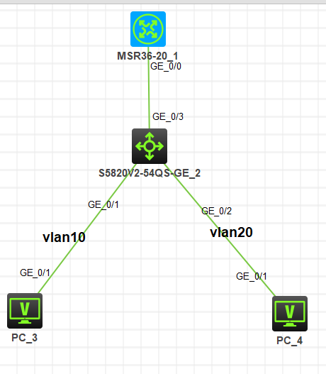 - PC3 属于 Vlan10,PC4 属于 Vlan20,配置单臂路由实现 Vlan10 和 Vlan20 三层互通