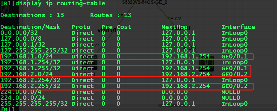 Direct就是直连的意思可以看出1.0网段的出接口是g0/0.1,2.0网段的出接口是g0/0.2[R1]display ip routing-table 查看路由表信息 -