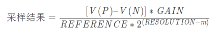 ADC 输出的采样取决与 CH[n].CONFIG 和 RESOLUTION 寄存器配置的参数,采样结果计算公式如下: