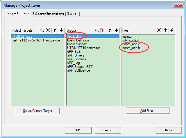 将 board_adc.c 和 board_adc.h 两个文件加入工程的Application文件夹下