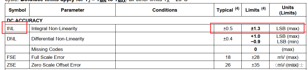 AD精度指的是AD实际转换的结果和理想的计算结果之间的误差,也叫做积分非线性误差,符号是(INL) 单位是LSB