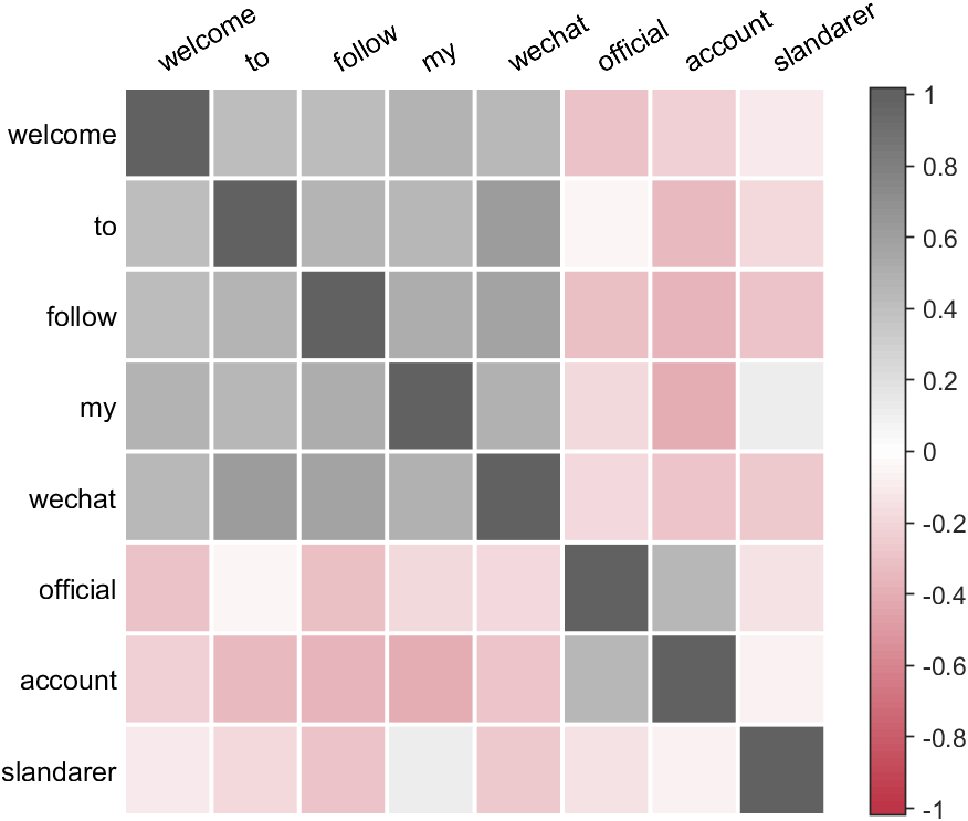 CMP=corrMatPlot(X,'Labels',{'welcome','to','follow','my','wechat','official','account','slandarer'});