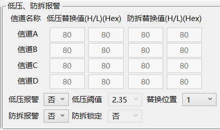低压报警选择为“是”时使能,建议低压阈值选择2.4V,替换位置由客户自行选择,替换值也可由用户自行填写。