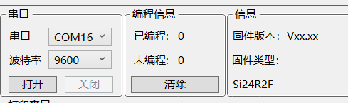首先排除串口是否被占用,没被占用时观察上位机右上角信息栏,看下固件类型是否是“Si24R2F编程器”。如果不是,则可能是固件丢失,重新加载固件即可。