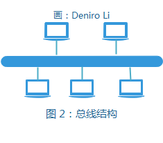 如图 2 所示,采用总线结构方式的网络,是由一条共享的通信线路将所有节点连接在一起,这条共享的通信线路可以是一根同轴电缆或其他介质。