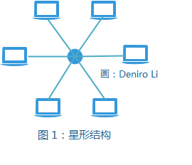 如图1所示,星形结构方式的网络在直观上就很容易理解,就像是一张蜘蛛网,中间是一个枢纽(网络交换设备),所有的节点都连接到这个枢纽上,最终组成一个星形的拓扑结构的网络。目前一般办公室的局域网便是该结构。