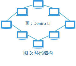 如图 3 所示,环形结构方式的网络,与总线结构类似,也是由一条共享的通信线路将所有节点连接在一起。不同的是,环形结构中的共享线路是闭合的,即它将所有的节点排列成一个环,每个节点只与其两个邻居直接相连。若一个节点想要给另一个节点发送信息,消息报文必须经过它们之间的所有节点。
