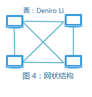 如图 4 所示,网状结构方式的网络就是任何节点彼此之间都会由一根物理通信线路相连,任何节点出现故障都不会影响到其他节点。采用这种拓扑结构方式的网络的布线比较麻烦,而且网络建设的成本也很高,控制方法也很复杂。在实际应用中,一般很少见到这种网络。