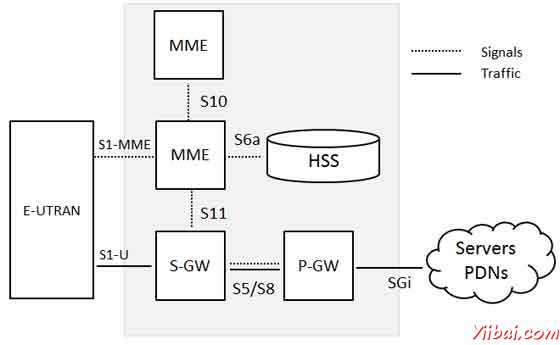 演进分组核心网与分组数据网络诸如因特网,专用企业网络或IP多媒体子系统在外界连通。系统不同部分之间的接口,Uu,S1和SGI表示,如下所示: