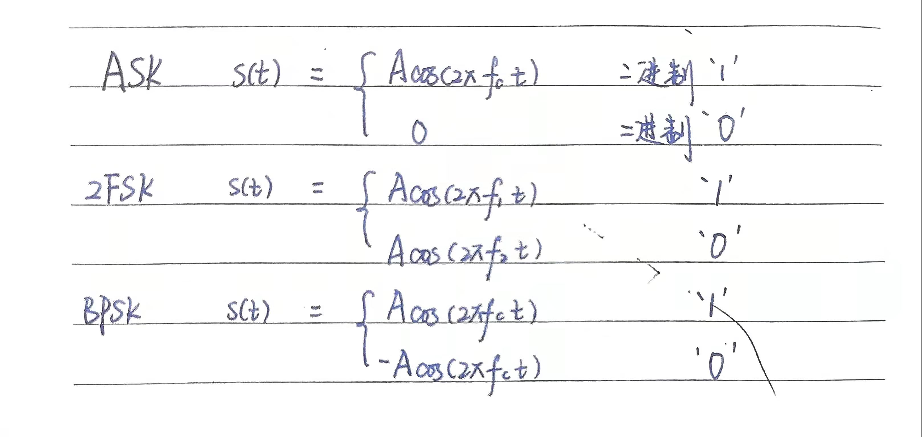 - 数字调制:幅移键控ASK、频移键控FSK、相移键控PSK、正交幅度调制QAM