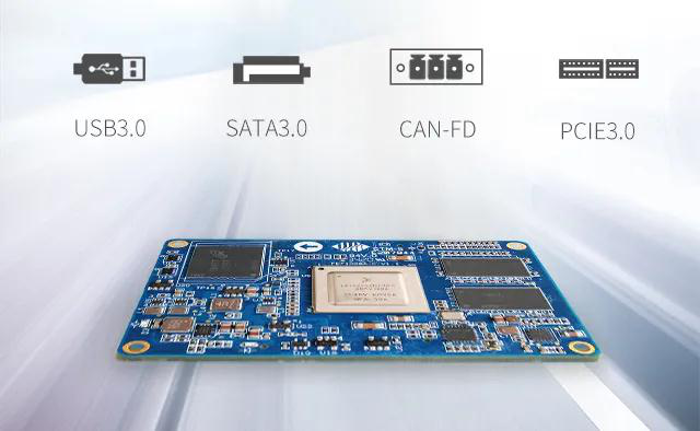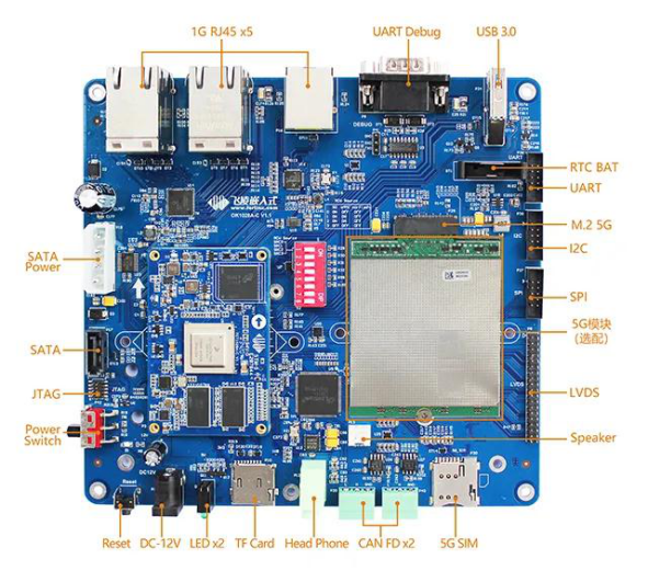 FET1028A-C 核心板原生支持 6 个 千兆网口,还具备 P CIe3.0 、 SATA3.0 、 USB3.0 、 CAN-FD 等高速总线接口,适用于工业互联网、 5G 联网终端等应用。同时,在配套开发板 OK1028A-C 底板上预设 4G 、 5G 、 WiFi 模块插口,满足客户即插即用的需求。