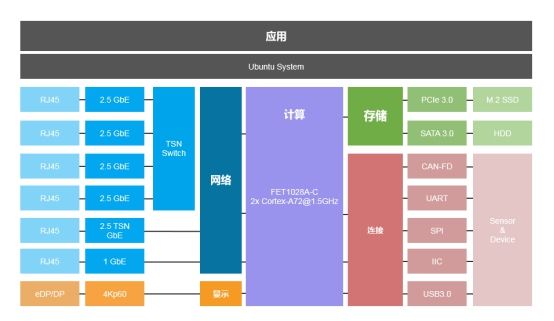 作为边缘计算服务的载体, 边缘计算网关起着至关重要的作用,不管是传感器接口、联网方式的多样性支持,还是 CPU的计算能力,都影响着边缘计算的能力。尤其在工业互联网的大背景下,IT与OT的融合也是边缘网关需要具备的重要能力,FET1028A-C具备6个支持TSN的千兆以太网接口,并内置一个支持TSN的4端口Switch,满足工业现场IT和OT网络的融合通讯。