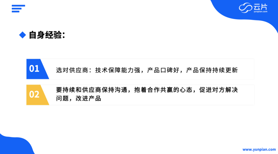 在供应商的选择层面,要关注供应商的口碑、技术保障能力、服务响应能力以及产品的持续迭代能力等维度;在和供应商后续的合作,要保持开放的心态,有问题尽管提,让供应商来提供解决方案同时对他们来说也是获得了更好的产品能力提升,总体上是合作共赢的。