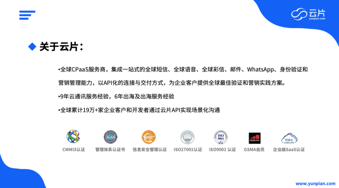 最后简单介绍一下我们云片。云片是一家全球CPaaS服务商(CPaaS就是通信平台即服务的意思),集成一站式的全球短信、全球语音、全球彩信、邮件、WhatsApp、身份验证和营销管理能力,把各种通讯能力通过API接口可编程化,为企业客户提供全球最佳验证和营销实践方案。我们有9年多的云通讯服务经验,6年出海及出海服务经验,目前全球累计已经服务过19万+家企业客户和开发者,帮助他们通过API实现场景化沟通。