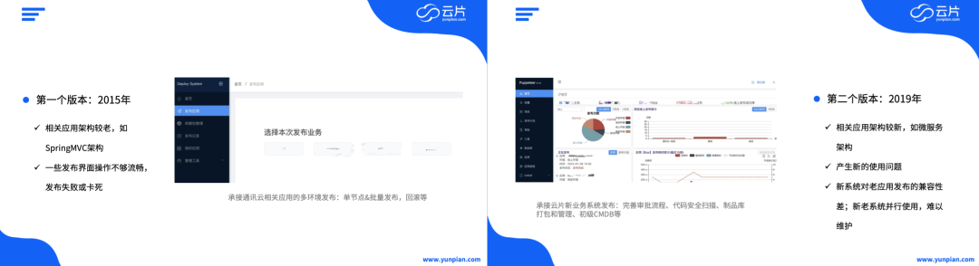 后来由于这个系统的bug和问题确实非常多,我们19年的时候,又开发了一套新的系统。这套和版本控制平台(比如gitlab)能更好的结合,同时权限控制方面做的比较好(例如上线的操作要让测试工程师来做,而不是开发工程师,也就是我们所有改动要上线是需要测试工程师同意的)。这套平台采用了当时流行的微服务架构开发,具备了初级的cmdb能力,完善了发布流程审批、具备权限管理、代码安全扫描、运行包版本管理能力。当然也引入了一些新问题,例如对老的应用不兼容,需要应用层面做好相关的改造才能使用新系统的持续集成能力,对应用方来说,是存在迁移成本的。此外,因为人员变动,这两个系统都难以维护,已知的使用问题得不到改进,出了问题只能运维手工做一些临时处理。