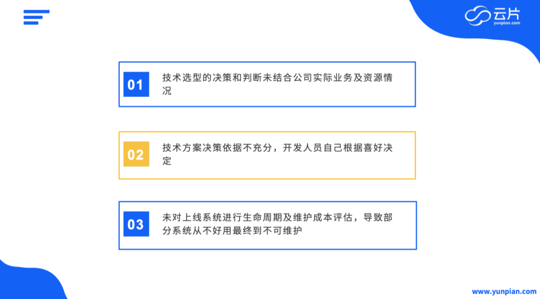 2.技术方案的决策依据不充分,部分依赖了开发人员或者架构师的喜好。