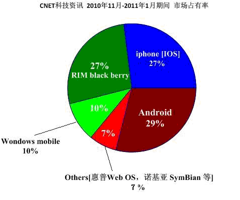 相信很多第三方依附体公司都会热衷于关注下一代移动市场的动向,对于没有能力和资金构架自己操作系统的公司来说,合理,正确的选择操作系统供应商是第三方小公司赖以生存的基石。之所以选择手机移动平台操作系统来作一谈论是因为手机移动平台能有力的支撑和指导车载娱乐信息系统的发展。首先先看一下CNET科技资讯网3月7日国际报道:在2010年11月-2011年1月份各大操作系统市场占有率的数据: