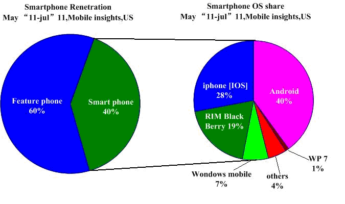 其中Android智能手机在美份额首超苹果iPhone销量和RIM黑莓。期间,Android在美市场份额为29%,iPhone和黑莓在美市场份额均为27%。三大顶级智能手机厂商操作系统相对稳定。期间,微软Windows Mobile和Windows Phone 7智能手机在美份额为10%,来自惠普的WebOS智能手机份额为4%,来自诺基亚的Symbian智能手机份额为2%。以下为到2011年5月的数据变化 :