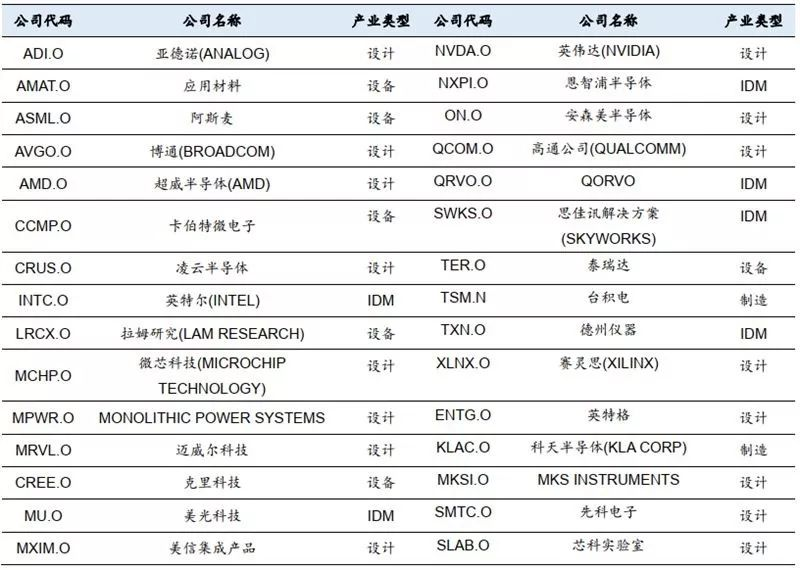 半导体设计厂商 17 家:高通、博通、英伟达、 AMD、赛灵思、迈威科技等;半导体设备厂商 5 家:应用材料、拉姆研究、阿斯麦、 卡伯特微电子、 克里科技;半导体制造厂商 2家:台积电,科天半导体;IDM 厂商 6 家:英特尔、美光、德州仪器、恩智浦、 Qorvo、 Skyworks。从下游应用分布来看, 以三星和高通为代表的厂商主要集中在手机和消费电子,以英特尔,博通, AMD 为代表的主要集中在 PC 和通信端。