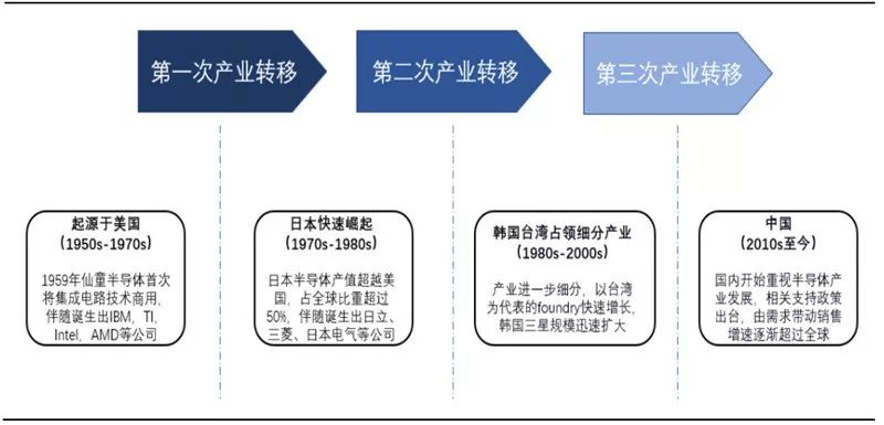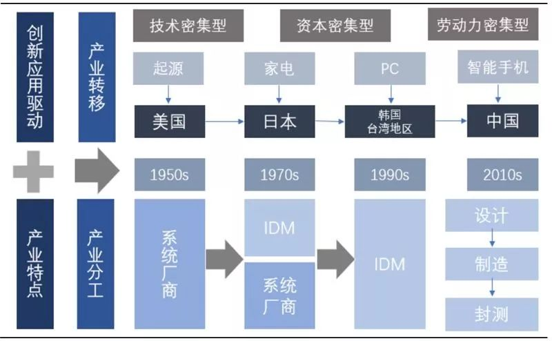 迁移路径由美国至日本再到韩国台湾, 演化模式由垂直整合到系统化集成,再到垂直分工。起源美国:垂直整合模式 1950s, 主要由系统厂商主导。全球半导体产业的最初形态为垂直整合的运营模式,即企业内设有半导体产业所有的制造部门,仅用于满足企业自身产品的需求。