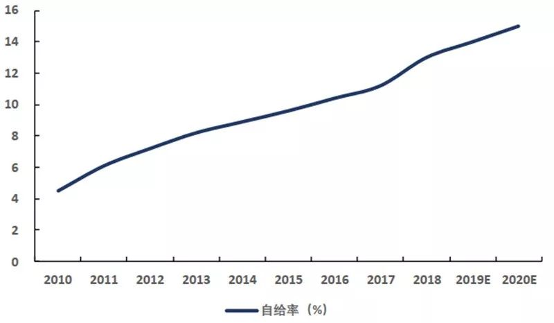 半导体目前是我国首要支持产业, 未来成长空间巨大。根据我国《中国制造2025》 规划目标, 到 2020 年,集成电路产业与国际先进水平的差距逐步缩小,全行业销售收入年均增速超过 20%, 企业可持续发展能力大幅增强。移动智能终端、网络通信、云计算、物联网、大数据等重点领域集成电路设计技术达到国际领先水平,产业生态体系初步形成。16/14nm 制造工艺实现规模量产,封装测试技术达到国际领先水平,关键装备和材料进入国际采购体系,基本建成技术先进、安全可靠的集成电路产业体系。到 2030 年,集成电路产业链主要环节达到国际先进水平,一批企业进入国际第一梯队,实现跨越发展。当前我国半导体产业的自给率才只有不到 15%, 根据《中国制造2025》 的目标,计划 2020 年自给率达 40%, 2050 年达到 50%。