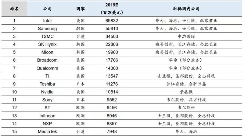 ▲2019 全球前 15 半导体公司收入预测及国内对标公司