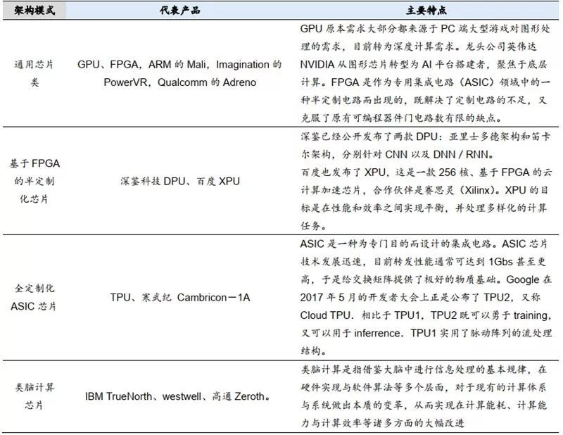 目前主流的架构分为四种:1、 通用类芯片,如 GPU、 FPGA 等;2、 基于FPGA 的半定制化芯片代表如深鉴科技 DPU、百度 XPU 等;3、 全定制化ASIC 芯片代表如 TPU、寒武纪 Cambricon-1A 等;4、 类脑计算芯片代表如 IBM TrueNorth、 westwell、高通 Zeroth 等。