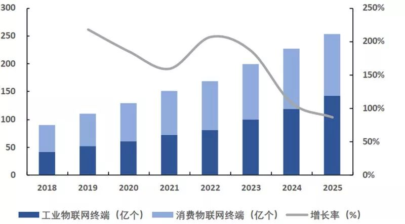 全球范围内,物联网终端数量高速增长。截止 2019 年,全球物联网设备连接数量达到 110 亿个,其中,消费物联网终端数量达到 60 亿,工业物联网终端数量达到 50 亿。根据 GSMA预测, 2025 全球物联网终端连接数量将达到 250 亿, 其中消费物联网终端数量达到 100 亿,工业物联网终端数量达到140 亿,占全球连接数的一半以上。物联网未来主要实现两类功能:对真实物体信息的采集、识别和控制;通过终端通信,将采集到的数据信息传输至决策服务端,并进行决策。主要模块分别为,硬件模块, 固件系统模块,应用模块,数据模块,通信接入模块。随着模块数量的爆发式增长, 将直线拉动相关半导体需求。