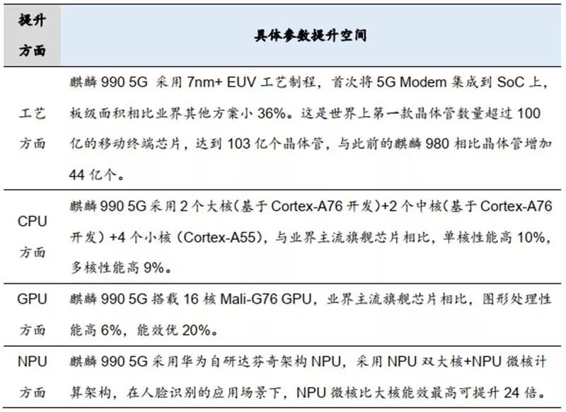 5G 网络基建期正值高峰,移动端芯片组性能爆发增长。芯片组包括射频集成电路(RFIC)、系统芯片(SoC)、专用集成电路(ASIC)、蜂窝芯片和毫米波(mmWave)集成电路。通讯巨头公司许多都在构建调制解调器、 RF 前端,或两者兼得, 其中设计的是低于 6GHz 的频谱,并支持 100MHz 的信封跟踪(ET)带宽。5G SoC 性能形成突破的主要原因:CPU 性能的进一步提升,制造工艺降低至 7nm 以下;GPU 方面,对于图像处理的能力大幅提升;NPU 方面采用了新的架构。以华为麒麟 990 为例,各方面的提升如下: