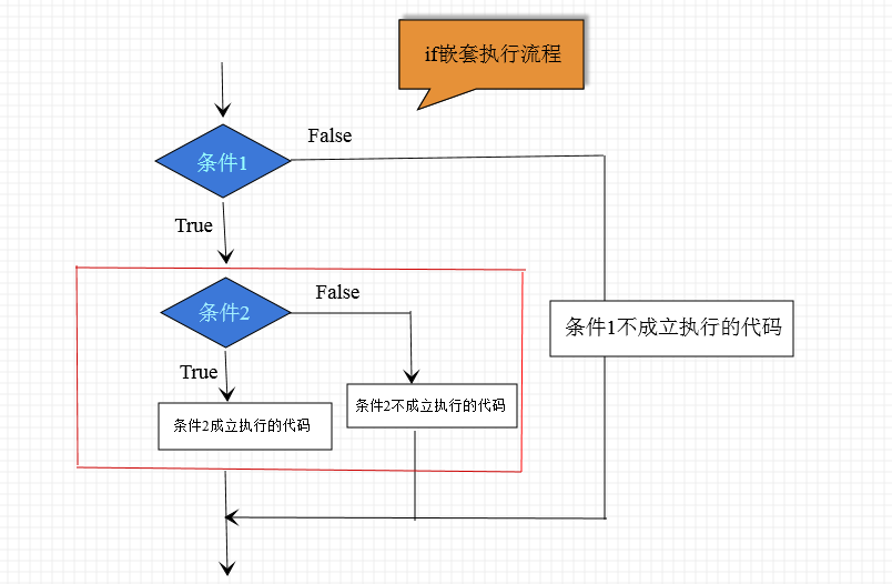 执行流程:先判断条件1是否成立,如果是False就进入到条件1不成立执行的的代码,如果条件1是True就进入到整个红色的代码块中,进行条件2的判断,如果条件2是False就执行条件2不成立执行的代码,如果条件2是True那就直接执行条件2成立执行的代码。
