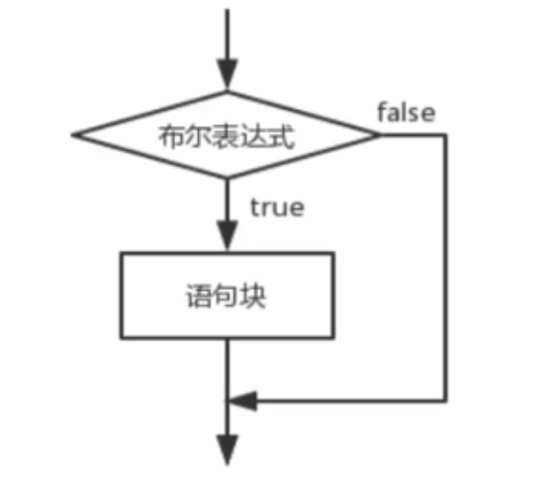 if 语句对布尔表达式进行一次判定,若判定为真,则执行{}中的语句块,否则跳过该语句块。其执行流程图如下: