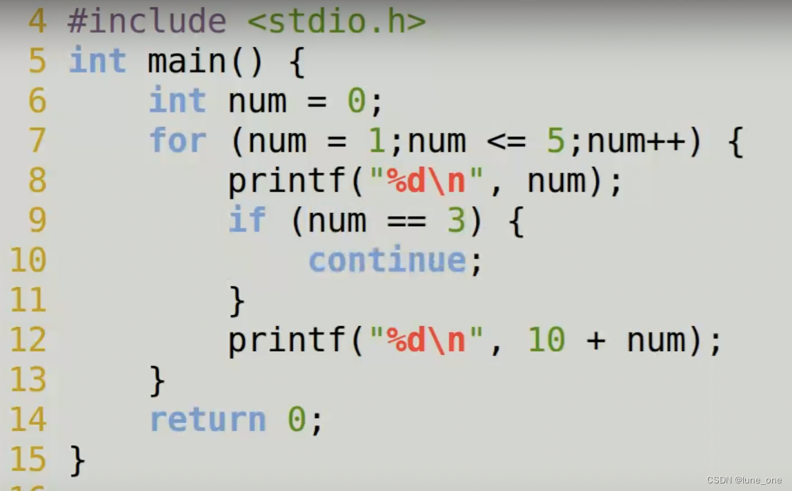 4.可以在循环大括号里使用continue;语句,直接跳到大括号的末尾,中间的所有语句这次循环都不执行。