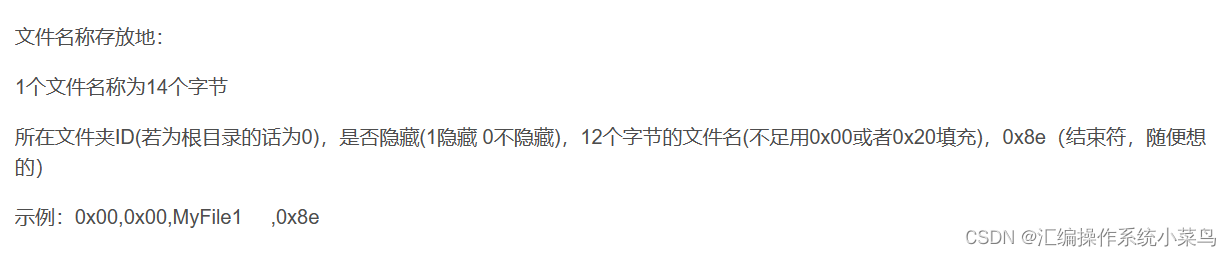所在文件夹ID(若为根目录的话为0),所在文件储存空间的第几个扇区,是否隐藏(1隐藏 0不隐藏),10个字节的文件名(不足用0x20填充),0x8e(结束符,随便想的)