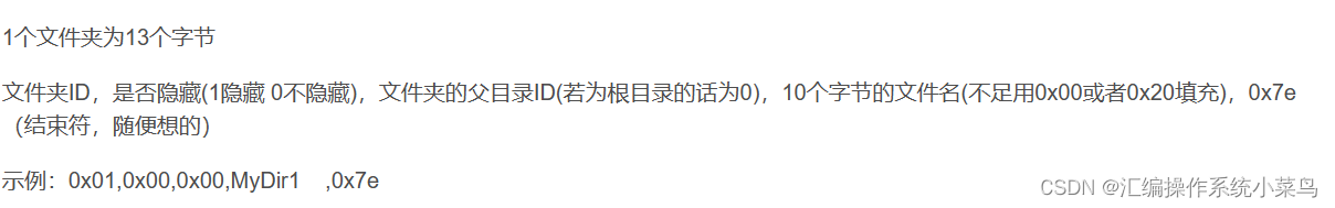 文件夹ID,是否隐藏(1隐藏 0不隐藏),文件夹的父目录ID(若为根目录的话为0),10个字节的文件名(不足用0x20填充),0x7e(结束符,随便想的)