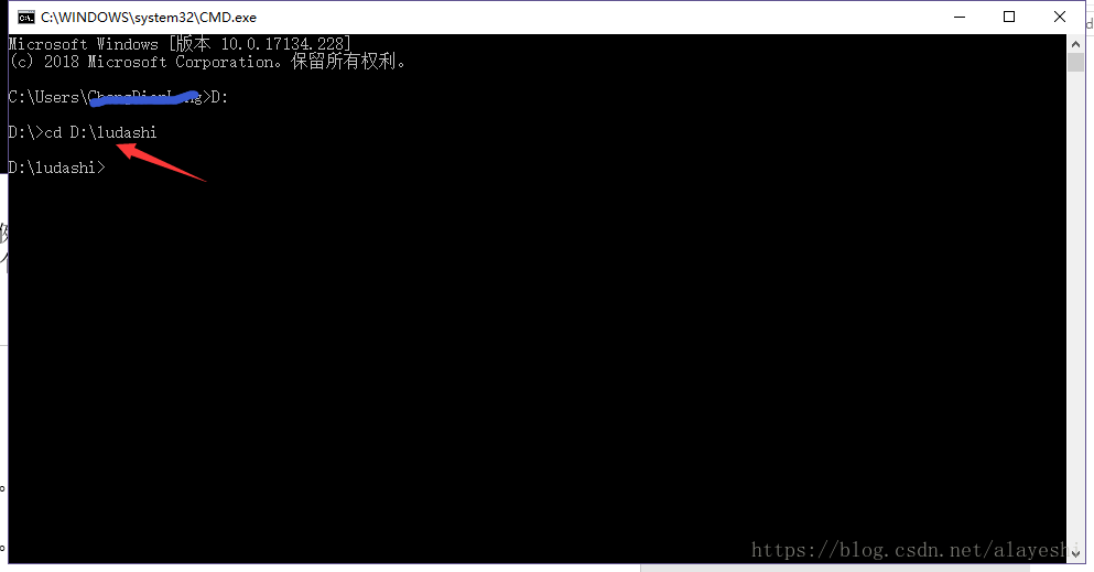 cd 目录名:进入特定的目录。例如到D盘里的ludashi文件夹里。直接写cd +路径名。(注意cd后面要按一个空格,然后才输入路径名。)如图: